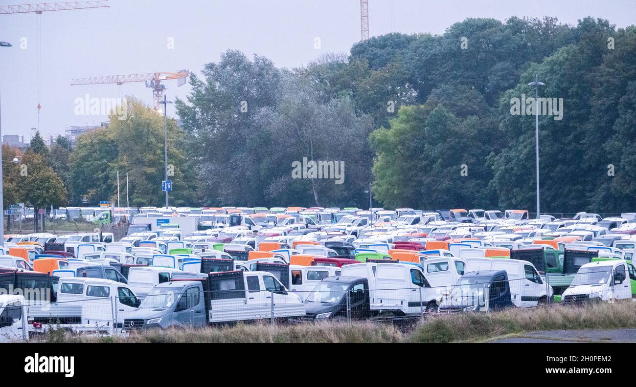 Hanover Germany 14th Oct 2021 New Commercial Vehicles From Mercedes Benz Are Parked In A Car Park At The Hanover Trade Fair The Permanent Supply Crisis For Microchips Is Now Causing The Daimler